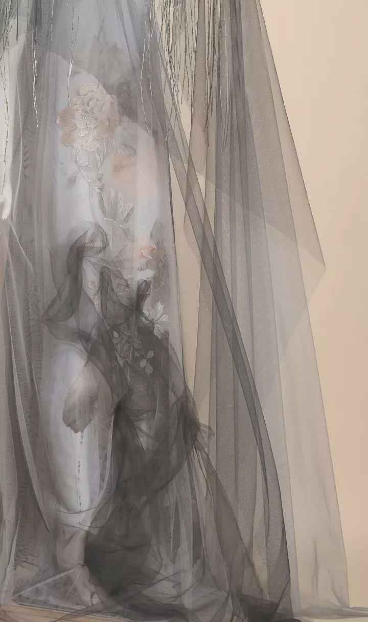 《风荷舞》作品一共分为三组,设计灵感来源于中国水墨画中风中荷叶飞舞的意像,作品采用了手绘、刺绣、晕染绣等工艺,将中国传统美学与现代设计完美融合,让东方女性如同风中轻舞的墨荷,摇曳生姿,动静之中展现变幻的灵性之美。